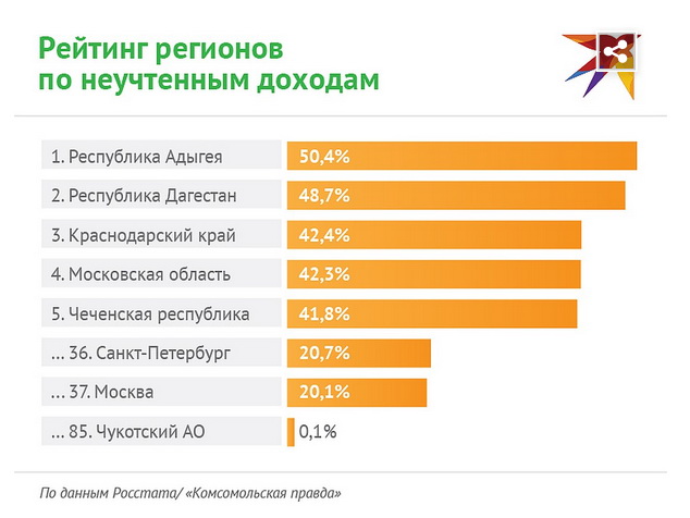 Доля неучтенных заработков сильно меняется от региона к региону. Часто у благополучных и проблемных субъектов показатель практически один – к примеру, в Подмосковье и Чечне. У Московской области неучтенки даже чуть больше. Самыми чистыми в плане доходов оказались регионы Крайнего Севера.