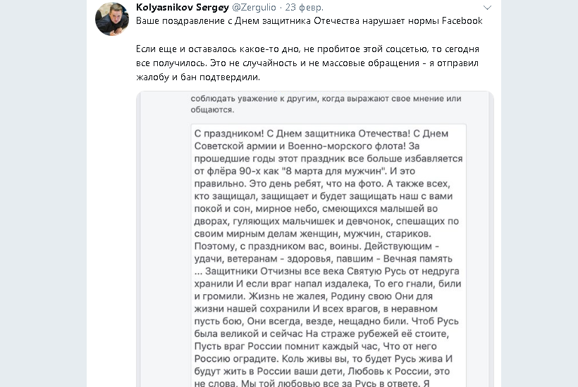 Администрация Facebook**** заблокировала пост российского блогера Сергея Колясникова (ник Zergulio), в котором он поздравил воинов с Днем защитника Отечества. Об этом он сообщил в своем твиттере.