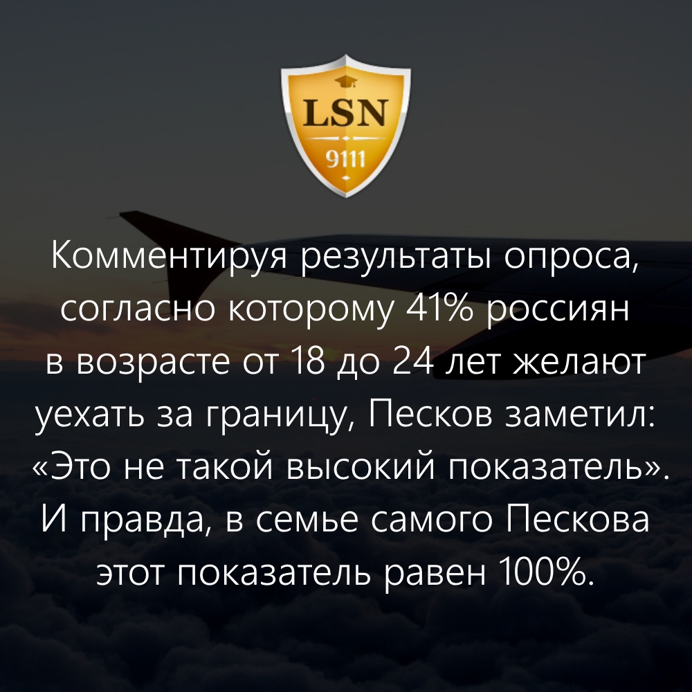 Комментируя результаты опроса, согласно которому 41% россиян в возрасте от 18 до 24 лет желают уехать за границу, Песков заметил: «Это не такой высокий показатель».