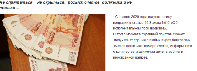 С этого момента судебный пристав сможет получать сведения о любых видах банковских счетов должника: номера счетов, информацию о количестве и движении денег в рублях и иностранной валюте.