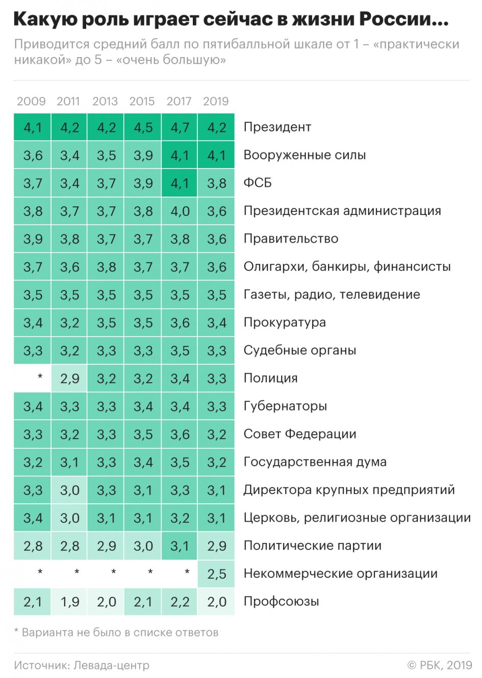 Левада-центр*** представил итоги всероссийского опроса, касающейся общественной роли различных институтов. Их деятельность респонденты оценивали по пятибалльной шкале. За два года, с января 2017 года, оценка роли президента снизилась с 4,7 до 4,2 балла, однако и с этим результатом президент остается самым влиятельным институтом, с точки зрения респондентов. В тройку лидеров по-прежнему входит армия (ее оценка остается неизменной - 4,1 балла) и ФСБ (снижение за два года с 4,1 до 3,8 балла).