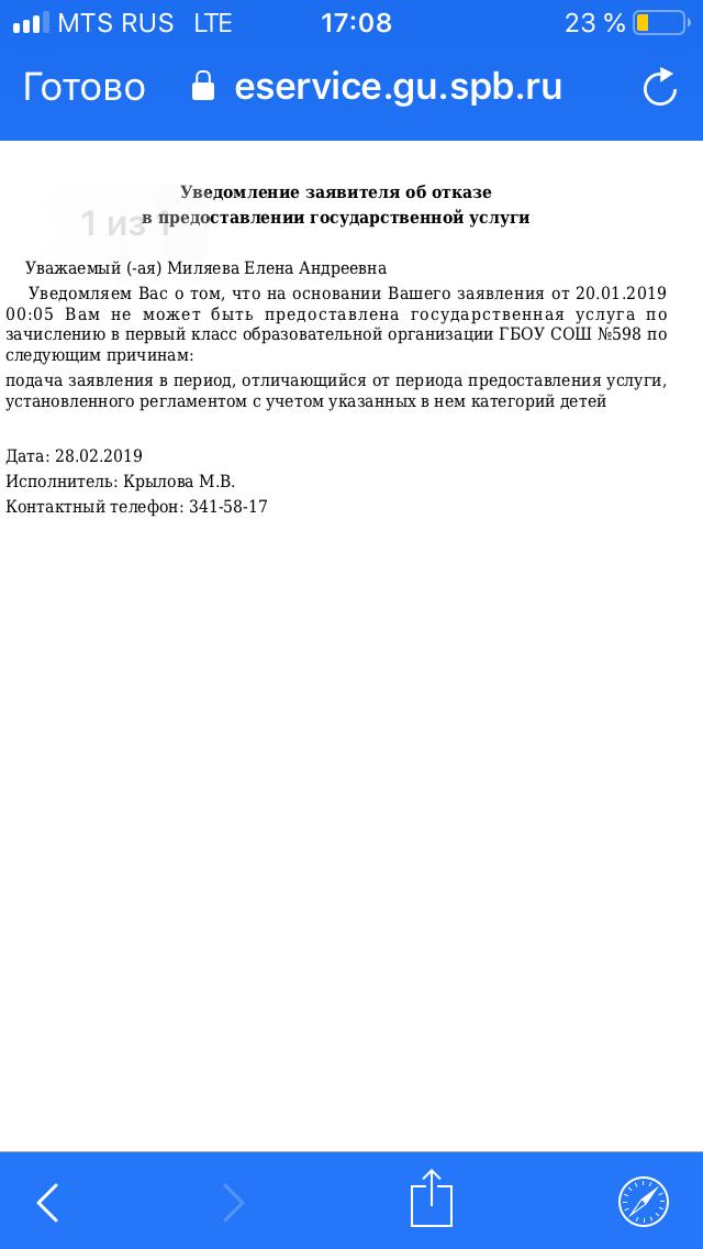 Добрый день. Вопрос по поводу отказа брать ребёнка в школу по причине подачи заявления в период, отличающийся от периода предоставления услуги, установленного регламентом с учётом указанных в нем категорий детей.