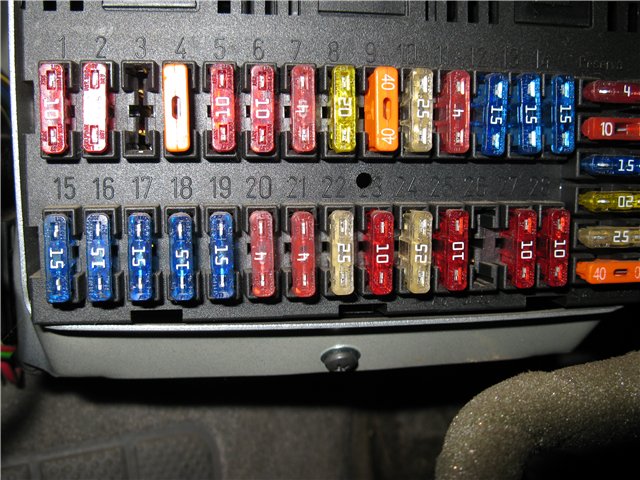 Далее открывайте крышку блока предохранителя. На каждом из них есть две металлические точки. Это контакты, между которыми расположена плавкая вставка. Далее необходимо с помощью лампы проверить все предохранители. Для этого нужно один провод прижать к вставке, а вторым поочередно коснуться точек. Если же лампа горит в обоих случаях, то предохранитель исправен, не горит вообще, это не тот элемент, который вы ищите.