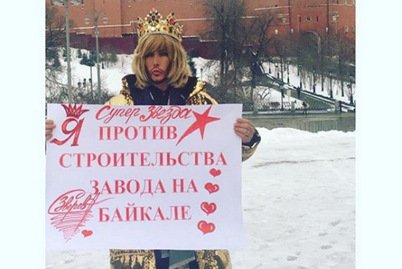 На фото Зверев стоит с короной на голове, а в руках держит плакат. В надписи на нем говорится, что стилист против строительства завода на Байкале.