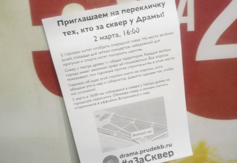 Политтехнолог не ошибается — на одной перекличке активисты останавливаться не намерены. Через две недели, 16 марта, в Ельцин Центре запланирован «концерт в защиту сквера на драме от застройки» (так указано в раздававшихся на «перекличке» листовках) с официальным хэштегом #скверубыть.