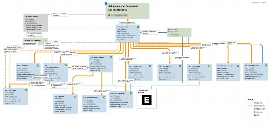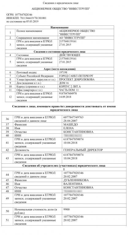 Но, как выяснила «Фонтанка», этот список мог бы расшириться. Речь идет о Валентине Константиновне Дубленниковой 1945 года рождения. Именно она по документам значится основным учредителем АО «Инвестгрупп». Кто сейчас является истинным владельцем АО "Инвестгрупп" – доподлинно неизвестно. Может, все еще Валентина Дубленникова, а может, и другие люди – особенности ведения реестра акционерных обществ позволяют закрывать эту информацию.