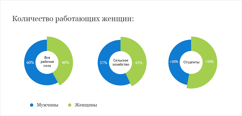Сегодня женщины составляют более 40% всей рабочей силы, 43% работающих в сельском хозяйстве и более половины студентов университетов в мире. Такие международные организации, как ООН, ЕС, ОЭСР (Организация экономического сотрудничества и развития), МОТ (Международная организация труда), рассматривают равенство полов как непосредственную составляющую нормального развития экономики любой страны и осуждают любую дискриминацию в профессиональной сфере.