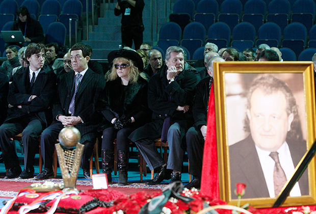 Артист Максим Галкин***, певцы Иосиф Кобзон, Алла Пугачева и Лев Лещенко (слева направо) во Дворце спорта «Видное» на церемонии прощания с известным бизнесменом, владельцем баскетбольной команды «Спартак», генеральным менеджером женской сборной России по баскетболу Шабтаем Калмановичем, который погиб в результате вооруженного нападения в центре Москвы в понедельник 2 ноября.