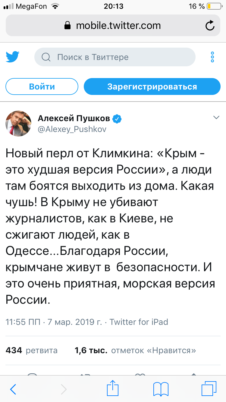 "Какая чушь! В Крыму не убивают журналистов, как в Киеве, не сжигают людей, как в Одессе... Благодаря России, крымчане живут в безопасности. И это очень приятная, морская версия России", - написал он.