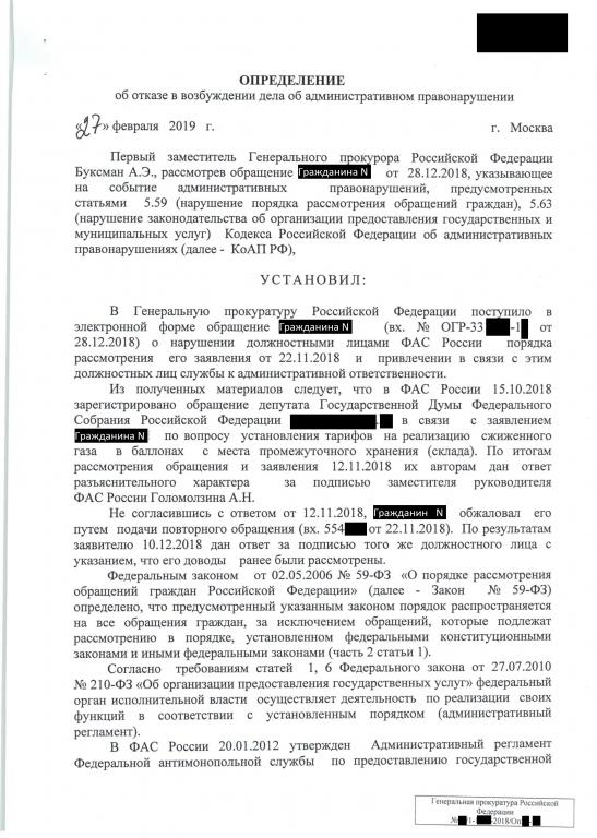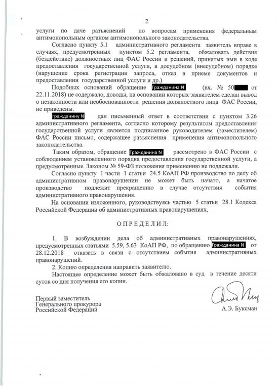 Ответ ФАС РФ от 12.10.2018 № АГ/***-ПР/** на моё первичное обращение был дан за подписью Голомолзина А.Н. (исполнитель Куриева Л.С.). С мнением ФАС РФ я не согласился, посчитав, что обращение не было внимательно рассмотрено и направил повторное обращение. Ответ на повторное обращение я получил за подписью того же Голомолзина А.Н., что является нарушением № 59-ФЗ «О порядке рассмотрения обращений граждан». Также примечательным является тот факт, что текст ответа в точности соответствовал тексту от 12.10.2018, в связи с чем я делаю вывод, что исполнитель Лобова Т.С., взявшая текст ответа у Куриевой Л.С. не делала ничего по рассмотрению моего повторного обращения. Исполнитель Лобова Т.С., и должностное лицо Голомолзин А.Н. своими действиями нарушили пункты 3,4 ч.1 ст. 10 № 59 ФЗ.