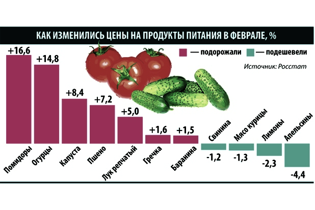 То есть никаких макроэкономических чудес не наблюдается: потребительские цены в России растут, и довольно существенно. Самое печальное, что среди лидеров месячного роста самые ходовые товары — продукты питания и медикаменты. Особенно сильно рванули вверх овощи, а также легендарные «макарошки» — практически все крупяные и макаронные изделия. Что касается лекарств, то, например, валидол за минувший месяц стал дороже на 5,8%, «Линекс» — на 2,3%. Среди прочих видов непродовольственных товаров на 3,0% подорожали свежесрезанные цветы, на 2,5% — кирпич, на 1,0–1,4% — бытовая техника, телевизоры, смартфоны, часы, сигареты с фильтром, спички...