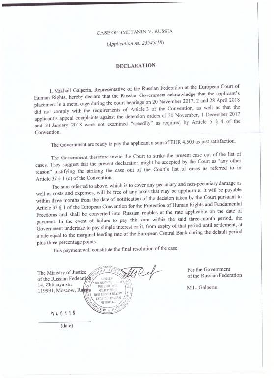 В марте 2019 года, мною из ЕСПЧ была получена декларация, согласно которой заместитель министра юстиции РФ Гальперин М.Л. признает нарушения, допущенные национальными судами-Московским городским судом, Таганским судом г.Москвы, Тверским судом г.Москвы и предлагает выплатить подзащитному компенсацию в 4500 евро, без рассмотрения моей жалобы ЕСПЧ. Мой подзащитный на компенсацию согласился.