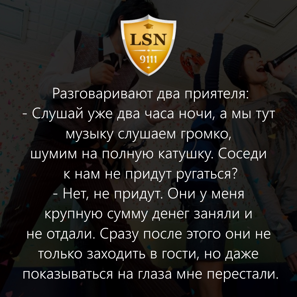 - Слушай уже два часа ночи, а мы тут музыку слушаем громко, шумим на полную катушку. Соседи к нам не придут ругаться?