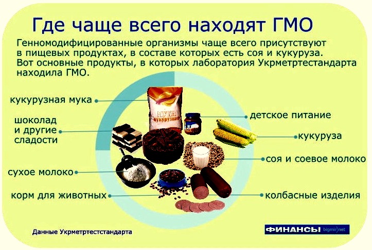 Это, прежде всего, соевый лецитин или лецитин E-322: связывает воду и жиры вместе и используется, как жировой элемент в молочных смесях, печеньях, шоколаде, рибофлавин (B2) иначе известный как E-101 и E-101A, может быть произведен из ГМ-микроорганизмов. Он добавляется в каши, безалкогольные напитки, детское питание и продукты для похудания. Карамель (E-150) и ксантан (E-415) также могут быть произведены из ГМ-зерна.