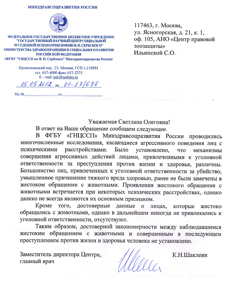 А вы верите статистике? По данным института Сербского, не существует связи между жестоким обращением с животными и тяжкими преступлениями против людей. Более того, настоящие убийцы и маньяки не проявляют жесткости к животным:
