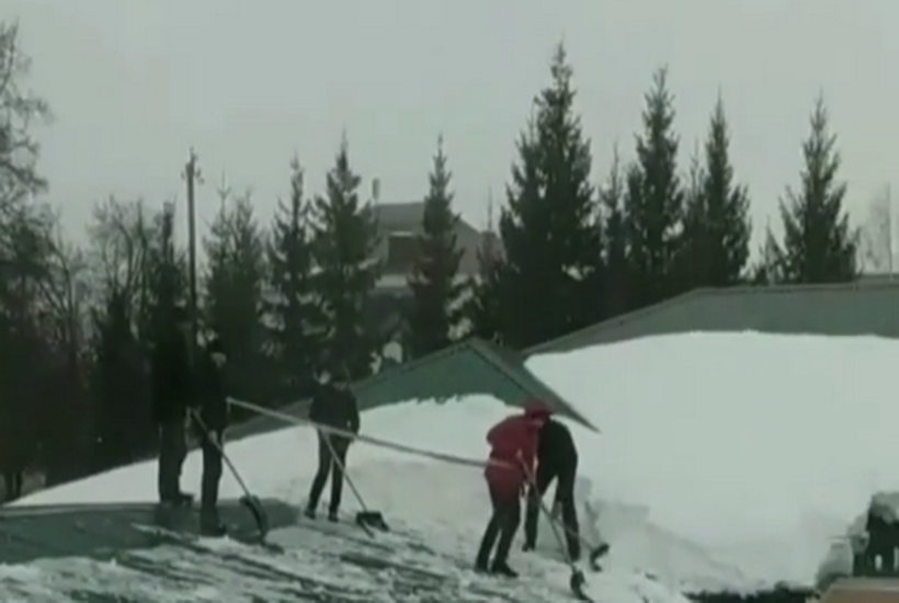 Ранее в сети появилось видео, на котором трое подростков и двое взрослых чистят снег с крыши школы. При этом тросом, второй конец которого мужчина держит одной рукой, обвязан был лишь один из школьников. Авторы ролика назвали такой уровень страховки «божественным».