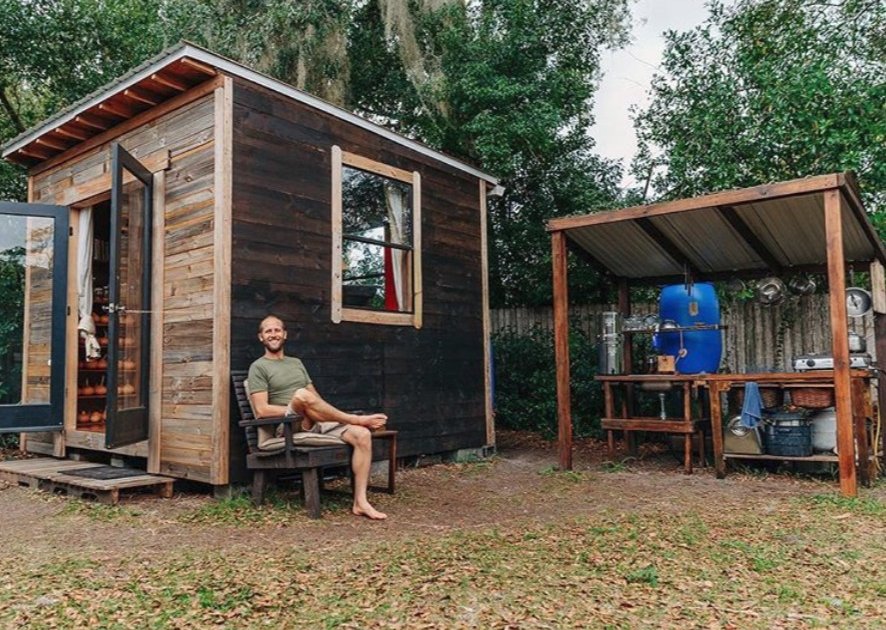 Площадь домика и наружной кухни — 30 квадратных метров. В жилище помещается кровать, несколько полок, стол и кладовая, в которой хранятся продукты. Небольшая зона для приготовления пищи размещена снаружи под навесом. По словам эколога, это все, что ему требуется для комфортной жизни.