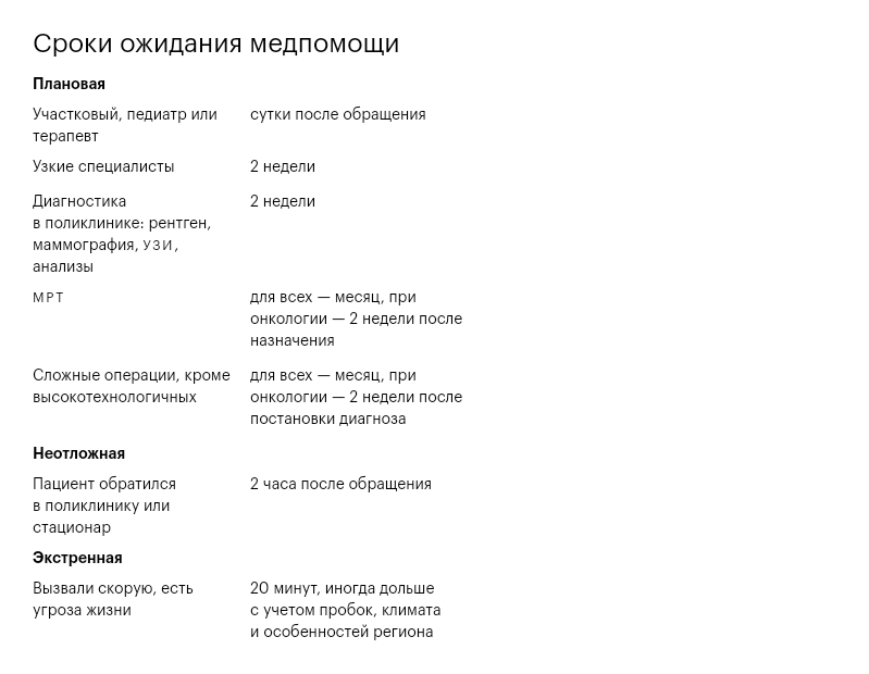 Для каждого вида — свои сроки ожидания. Максимальные сроки устанавливает не поликлиника и не конкретный врач, а закон. Если скорая при инфаркте едет три часа — это нарушение. А вот ждать, пока проведут томографию, можно и две недели — все по закону.