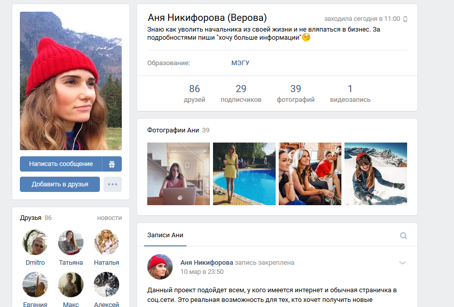 На указанной Екатериной странице действительно используются ее личные снимки, а также совместные фото с мужем и сыном. Создатель страницы под именем Аня Никифорова (Верова) предлагает научить всех желающих получать доход от работы в интернете.