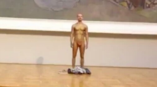 Вечером 20 марта вТретьяковской галерее в зале Михаила Врубеля на глазах у посетителей музея мужчина разделя почти до гола, оставшись только в красных стрингах. На спине мужчины были непонятные символы, нанесенные красной краской.