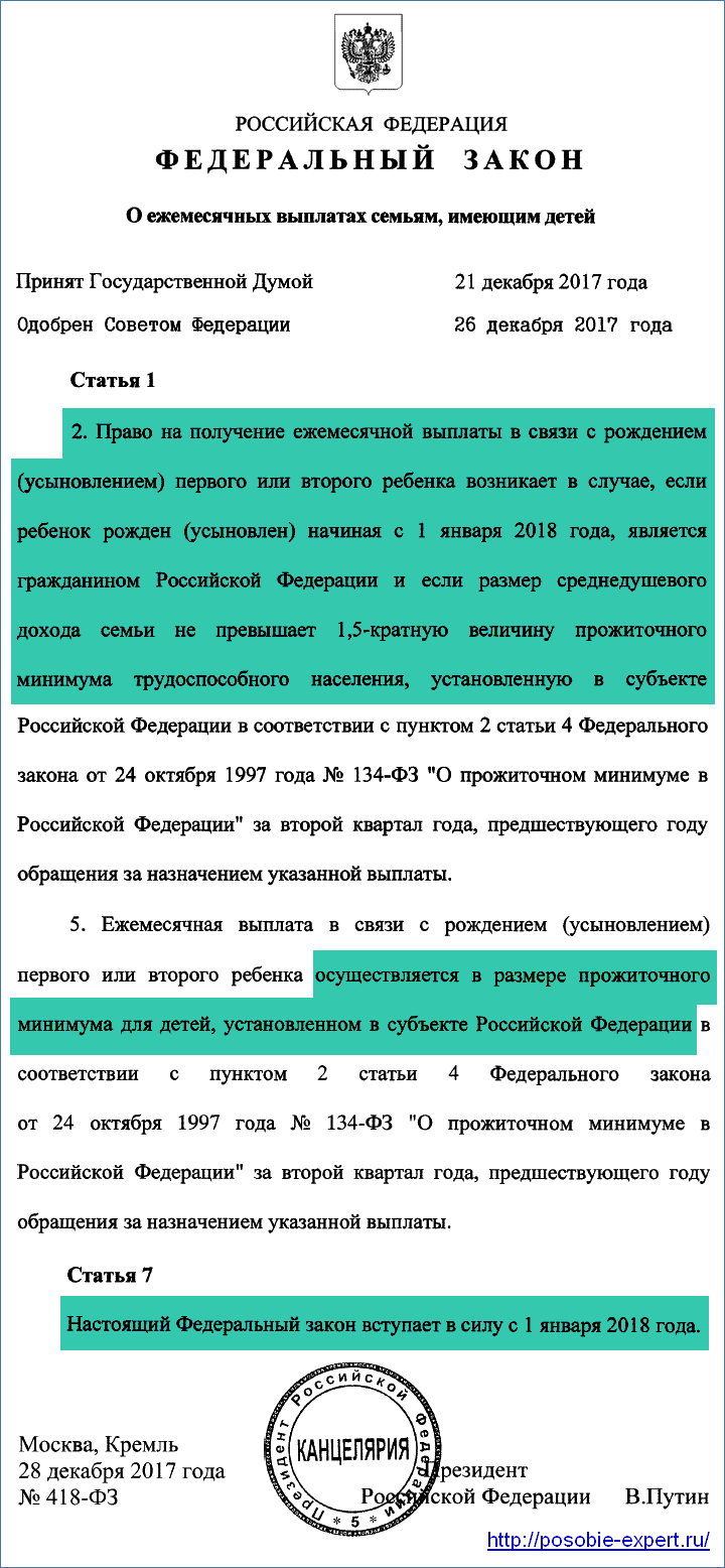 Российским семьям при рождении первого ребенка с 1 января 2018 года уже выплачивается новое ежемесячное пособие в размере установленного в регионе прожиточного минимума для детей (в среднем по России в 2018 году составит около 10500 рублей). Новая ежемесячная денежная выплата (ЕДВ) будет полагаться нуждающимся семьям до достижения 1.5 лет. К сожалению, если ребенок родился в 2017 году и еще не достиг возраста полутора лет, то новые «президентские» пособия такой семье полагаться не будут (именно так устанавливается в новом законе «О ежемесячных выплатах семьям, имеющим детей» от 28.12.2017 г. № 418-ФЗ, который вступил в силу с 1 января 2018 года). Аналогичная выплата с 2018 года законом предусмотрена и при рождении второго ребенка — только уже за счет средств материнского капитала.