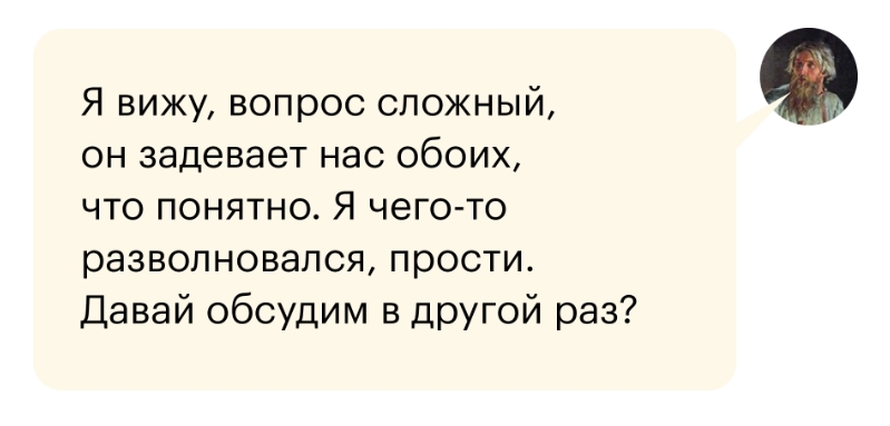 Как только появились эмоции, берите паузу. Не обвиняйте собеседника в несдержанности, возьмите ответственность на себя: