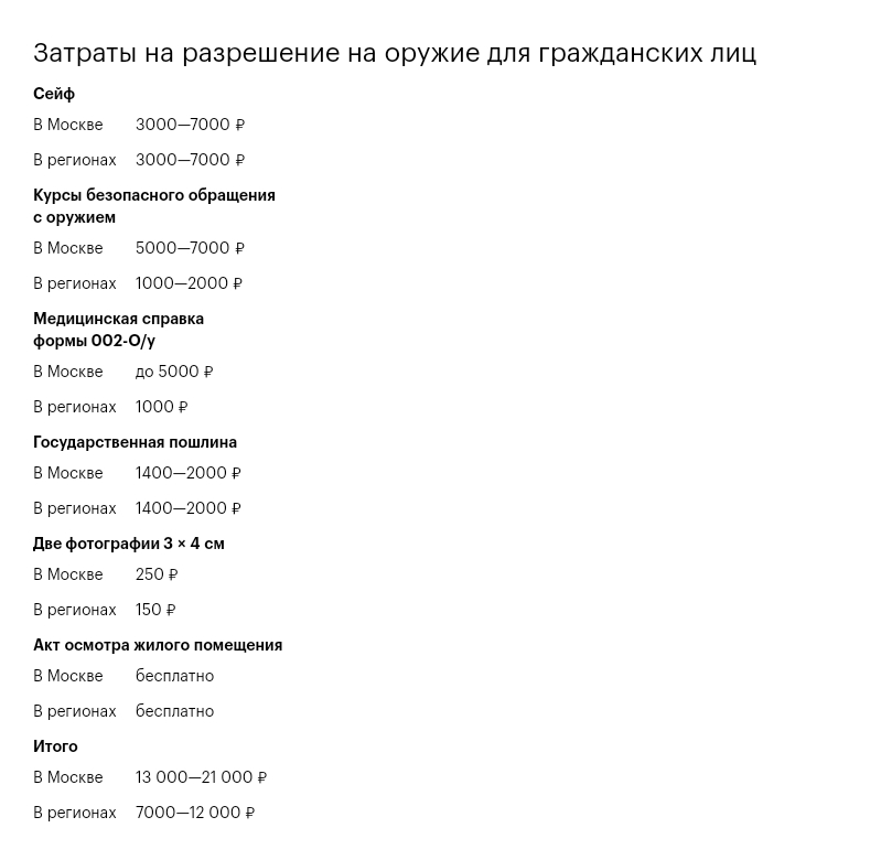 Закон предписывает пройти курсы по безопасному обращению с оружием. Обучение обычно формальное, и не сдать очень сложно. Обучение проводится на базе стрелкового клуба, тира «Динамо» или Федерации практической стрельбы. Стоимость в регионах — 1—2 тысячи рублей, в Москве — 5—15 тысяч.