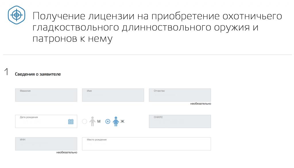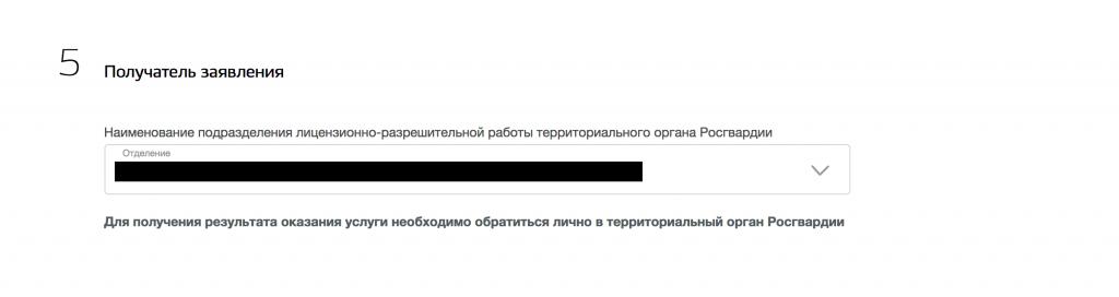После внесения личных данных необходимо выбрать получателя заявления. Сначала выбираем областное управление, затем переходим к списку районных, а потом выбираем ваш городской ОЛРР. Сайт просит указать сведения об оружии, но это поле можно не заполнять