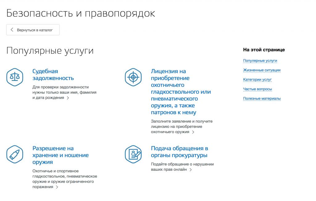 Найдите в разделе «Категории услуг» пункт «Безопасность и правопорядок». Выберите пункт «Лицензия на приобретение оружия ограниченного поражения и патронов к нему»