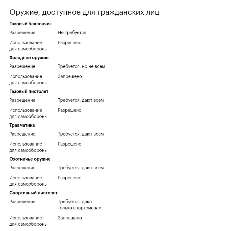 Закон «Об оружии» разделяет гражданское, служебное, боевое ручное стрелковое и холодное оружие. Для большинства доступнее всего гражданское и холодное. Гражданское оружие делится на спортивное, газовое, травматическое и охотничье.