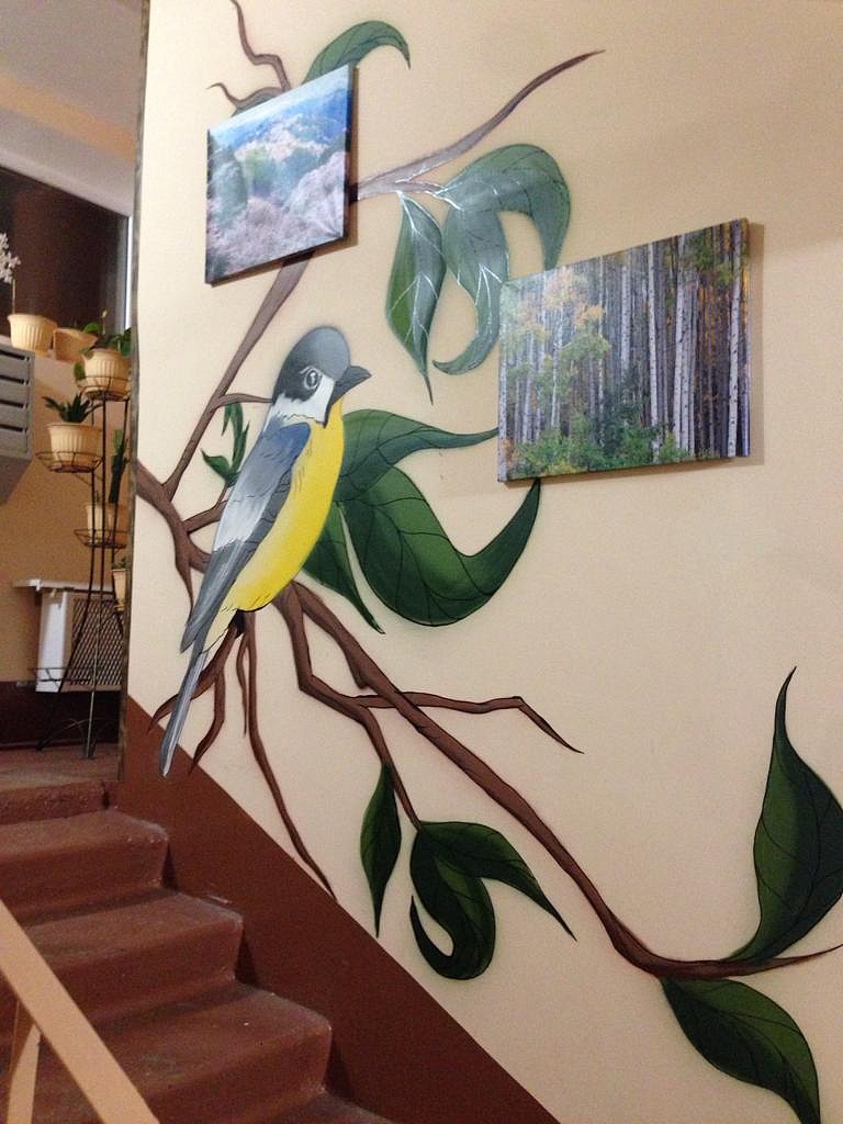 Совсем недавно этажи подъезда дополнили граффити. Теперь, весеннее настроение создают синица, снегирь и другие птицы. Эта парадная заняла второе в место в муниципальном этапе конкурса в номинации «Лучший отремонтированный подъезд с участием жителей». Об их активности знает уже весь микрорайон Климовск. Управляющая компания гордится такими жителями и всячески старается помогать.