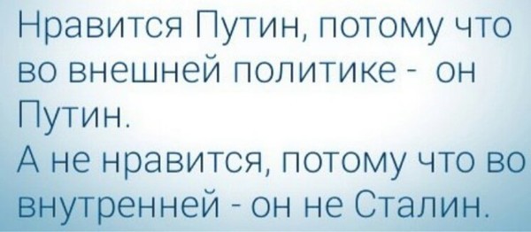 В социальных сетях весьма распространена такая позиция: люди лично Путина поддерживают, но при этом ругают, и довольно жестко, многих из тех, кто вокруг него: и правительство, и ЦБ, и близких к власти олигархов, и тем более «Единую Россию». Ругают иногда даже самого Путина — за либерализм по отношению к внутренним и внешним врагам. Как говорят сами эти люди, мы ругаем Путина не за то, что он слишком Путин, а за то, что он недостаточно Путин.