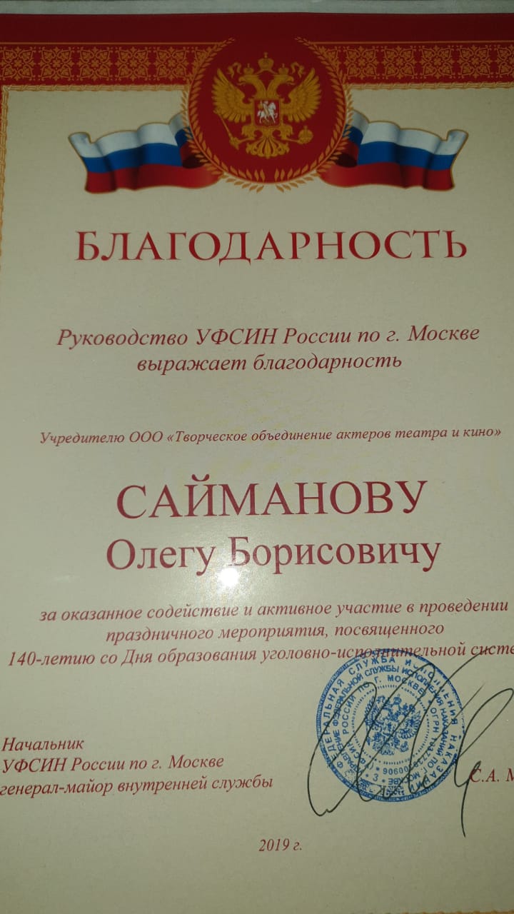 Заместитель генерального директора ООО «Творческое объединение актеров театра и кино» Сайманов Олег Борисович, который неоднократно оказывал содействие ФСИН России в организации концертов и праздничных вечеров, поздравил всех сотрудников уголовно-исполнительной системы с 140 годовщиной УИС.