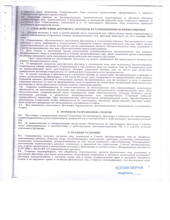  Существенное условие о застрахованном лице В соответствии с п. 7.1. Договора, договор вступает в силу с даты начала срока страхования в первом подписанном Сторонами Списке застрахованных лиц (далее по тексту - реестр). Принимая во внимание п. 6.4. Договора список застрахованных лиц отправляется Банком в Страховую компанию не позднее 5 числа каждого месяца. Сам договор имеет дату его подписания 22.11.2012 г. Таким образом, первый список застрахованных лиц был отправлен Страховщику 05.12.2012 г. При этом на дату подписания договора стороны не имели не одного застрахованного лица, а как следствие не имели возможности согласовать его существенное условие. Согласование условий определения застрахованного лица не является способом достижения соглашения о его существенном условии, так как условия о застрахованном лице должны содержать конкретные данные конкретного застрахованного лица.