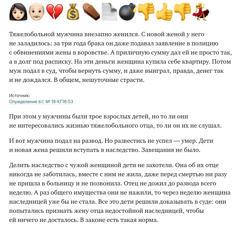 Мужчина нуждался в постоянном уходе, но она за ним не ухаживала. По крайней мере, так говорят дети. Новая жена даже жила отдельно, а после смерти вообще не участвовала в похоронах. Но это все слова, а дети запаслись документами.