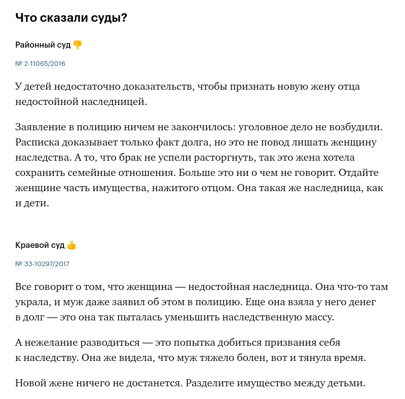 Получается, что у отца не было семейных отношений с новой женой. Более того, она ему вредила, не содержала его и взяла в долг деньги, чтобы уменьшить наследственную массу. Да и какая она жена, если брак оформлен незадолго до смерти, а общего имущества не было? В общем, наследники хотели признать женщину недостойной наследницей.