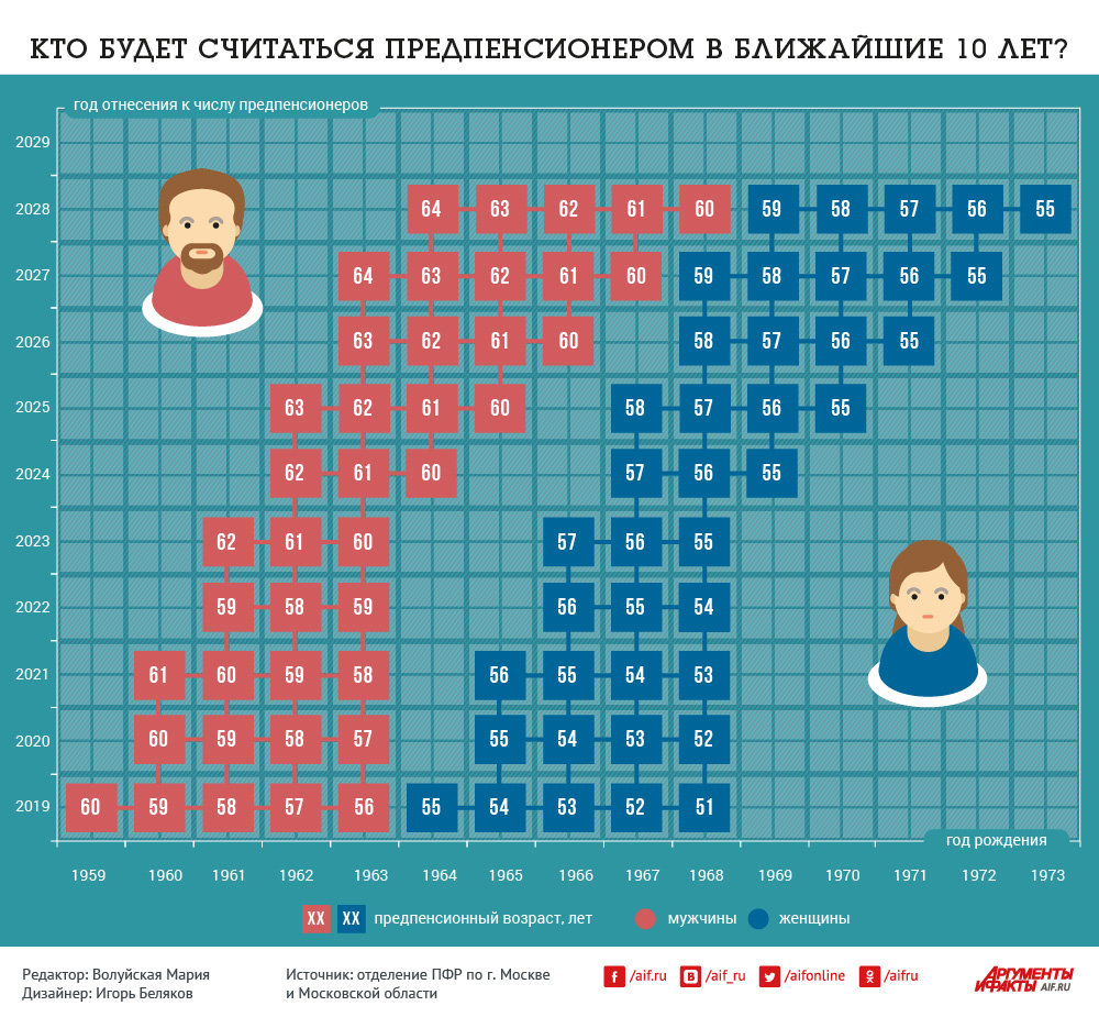 Согласно пенсионному законодательству, к новой льготной категории — предпенсионерам — относятся граждане в возрасте «не более чем за 5 лет до достижения пенсионного возраста». В 2019 году предпенсионерами считаются женщины, достигшие 51 года, и мужчины, достигшие 56 лет.