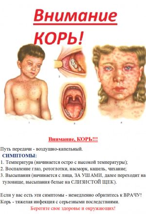 Корь – вирусное заболевание, с инфекционным характером и острым течением. Обычно ей сопутствуют высокая температура (до 40,5 °C) и воспаление слизистых дыхательных путей, рта. Характерные признаки кори - конъюнктивит и сыпь по телу. Осложнения приводят к пневмонии, ушным инфекциям, воспалению мозга-в среднем, 1 из 1000 от осложнений умирает. Чаще болеют дети.