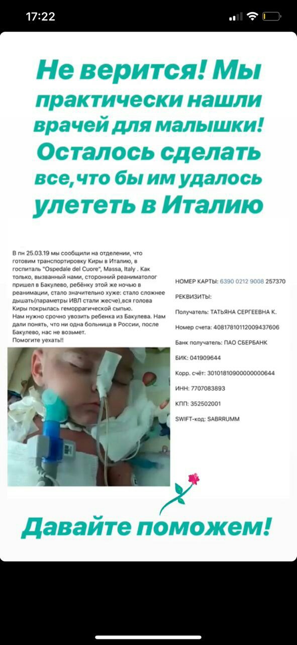 Кире сделали операцию на сердце в ноябре, во время операции занесли в шов инфекцию. С ноября по сегодня она находится в реанимации. Врачи должного лечения не проводят, препятствуют транспортировки ребенка в другие клиники. Лео Бакерия главный кардиохирург России на встречу и любой контакт не идёт. Сейчас нашли возможность перевести Киру в Италию, наши институты после Бакулева не берут! СМИ почему-то нашу ситуацию отказываются освещать.