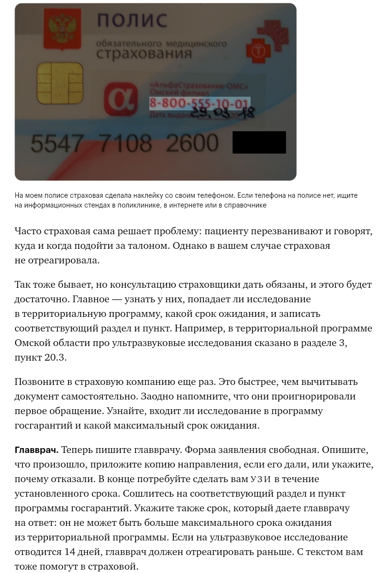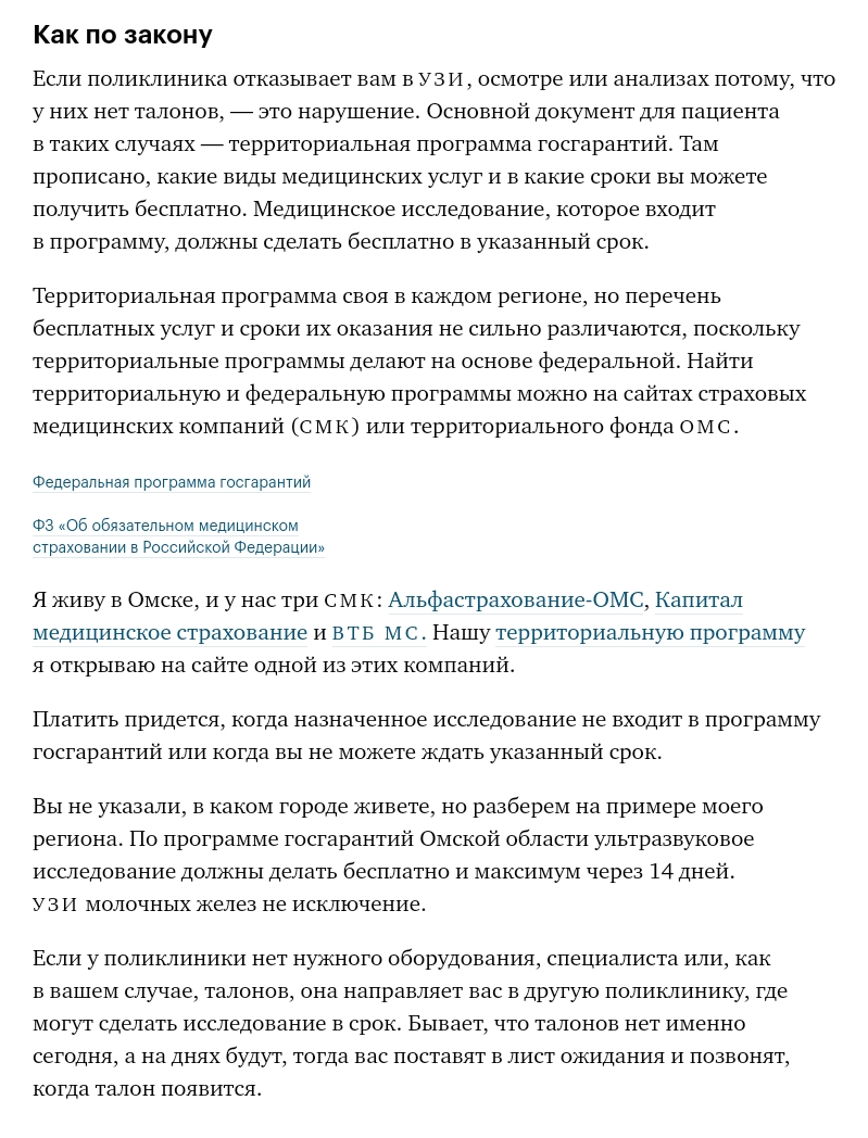 Я читала и видела по телевизору, что большинство обследований должны делать бесплатно по полису ОМС. Сказала об этом врачу, а он в ответ: «Я никому ничего не должен! Где я вам возьму талоны? Нам их выделяют по минимуму, вы не успели — что я теперь могу сделать?»