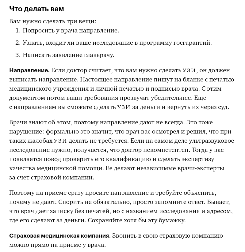 Пройти исследование платно и подать в суд иск с требованием возместить расходы. Этот вариант подходит еще и в том случае, когда человек сначала заплатил, а потом узнал, что можно было сделать бесплатно. Чтобы выиграть процесс, нужно иметь направление. Я не знаю случаев, чтобы кто-то судился из-за УЗИ, но суды по дорогим исследованиям, например МРТ, результат приносят. Обычно в итоге пациенту звонят из поликлиники со словами: «Подойдите в кассу».