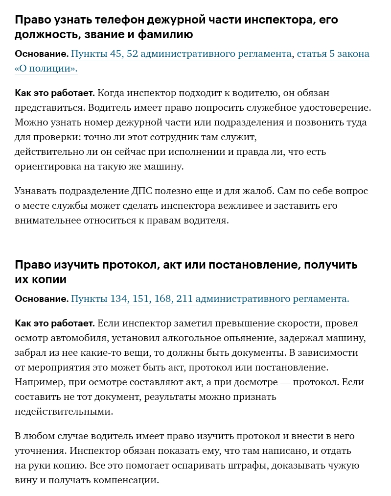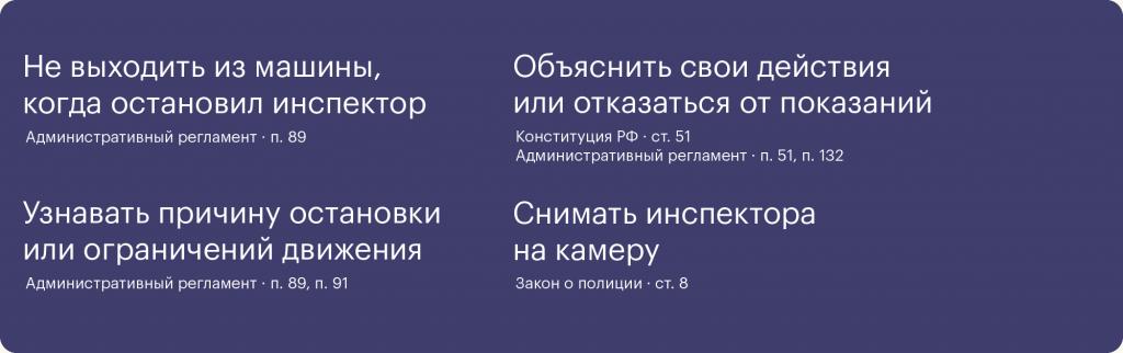 Поговорим о правах, которые у вас есть при остановке машины инспектором ГИБДД: что можно делать, что требовать, от чего отказаться и что контролировать. Все эти права — из Конституции, закона о полиции, административного кодекса и регламента для сотрудников ГИБДД.