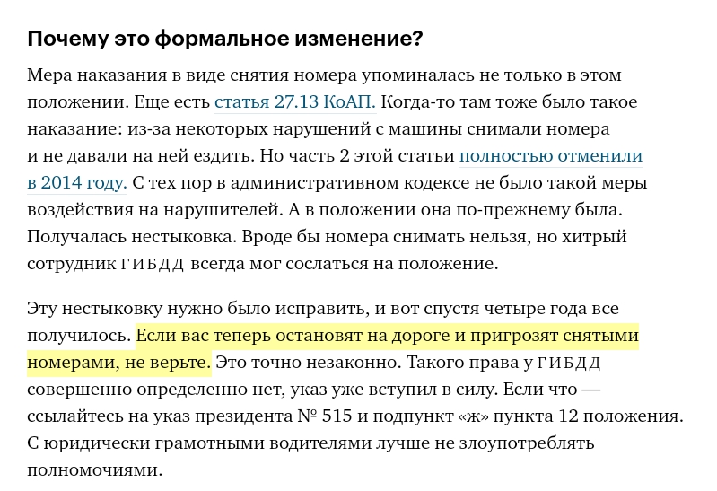 Гаишники не могли скручивать ваши номера аж с 2014 года. Но была юридическая дырка, из-за которой они могли напугать водителя скручиванием номеров: по закону это делать нельзя, а по положению о ГИБДД — можно. Если водитель об этом не знал, гаишник мог размахивать перед ним этим положением и намекать на взятку. Ведь был действующий документ, в котором написано: сотрудник ГИБДД имеет право снимать номера с машины.