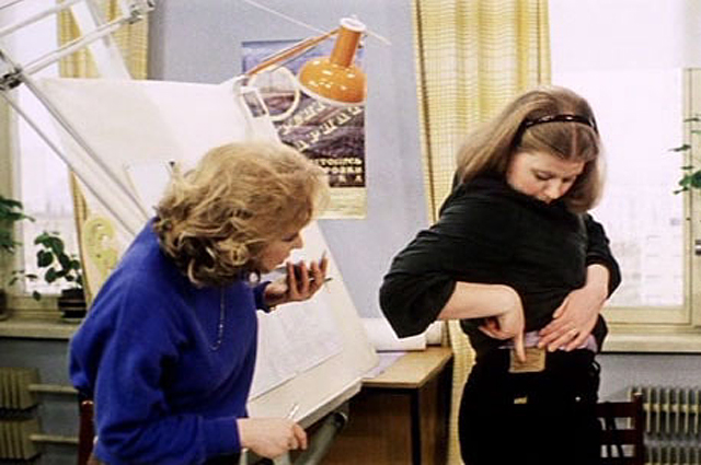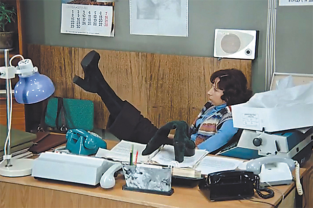 «Это Верочка. Оклад у неё секретарский, а туалеты сплошь заграничные. Как ей это удаётся — загадка». Кадр из фильма «Служебный роман». 1978 год.