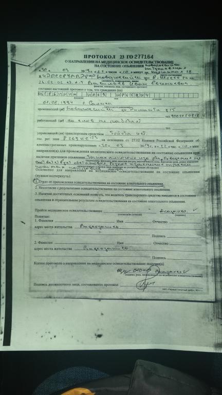 Здравствуйте, столкнулся с недобросовестными сотрудниками ДПС, хочу выяснить законность их действий. 30.03.2019 в 21:40 я начал управлять транспортным средством, имея при себе водительское удостоверение и страховой полис, в котором я вписан. После начала движения на автомобиле, меня остановил экипаж из трёх человек, после проверки документов, под психологическим давлением сотрудники записали видео на камеру мобильного телефона, в котором заставили меня сказать, что я отказываюсь от прохождения медицинского освидетельствования. Я понял, что сейчас произошло, я зову свидетелей и говорю сотрудникам, что хочу пройти медицинское освидетельствование, на что мне отвечают-"Хорошо, только нужно вызвать эвакуатор". После этих слов я предложил передать автомобиль моему знакомому, сотрудник согласился на это и начал составлять протокол об отстранении меня от управления транспортным средством, после чего мой знакомый расписался в нём и передали его мне, я спросил сотрудника, когда мы поедем на медицинское освидетельствование? После моих слов сотрудник забрал у меня протокол, не давая мне возможности в нём расписаться, сели в машину и просто уехали. При этом водительское удостоверение и свидетельство о регистрации тс, за рулём которого я находился, выдали знакомому. После этого у меня спросили номер телефона и адрес регистрации, данные я сообщил. Возможно ли таким образом собранный материал по 12.26 КоАП РФ направить в суд и есть ли шансы оспорить действия сотрудников?