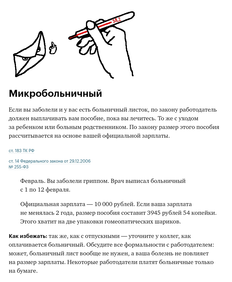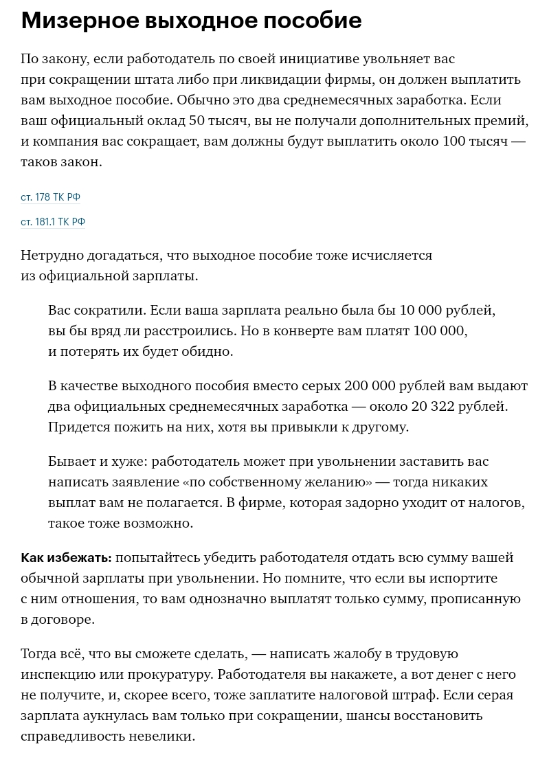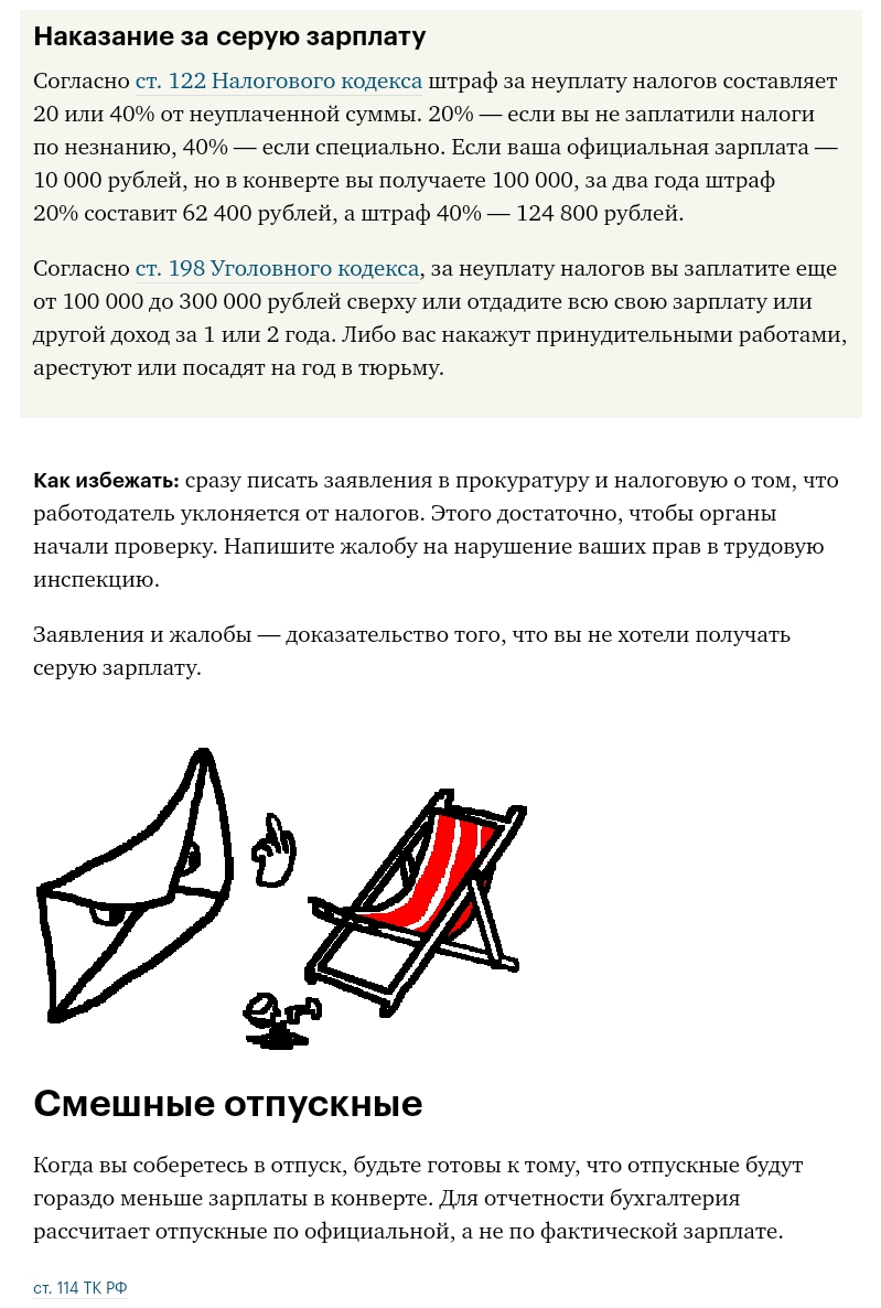 Как избежать: уточните заранее у коллег, как выплачивают отпускные. Если по-белому, поговорите с работодателем. Возможно, в этом разговоре вы выясните, что никаких отпускных вам вообще не полагается и формально вы свой отпуск уже давно отгуляли.