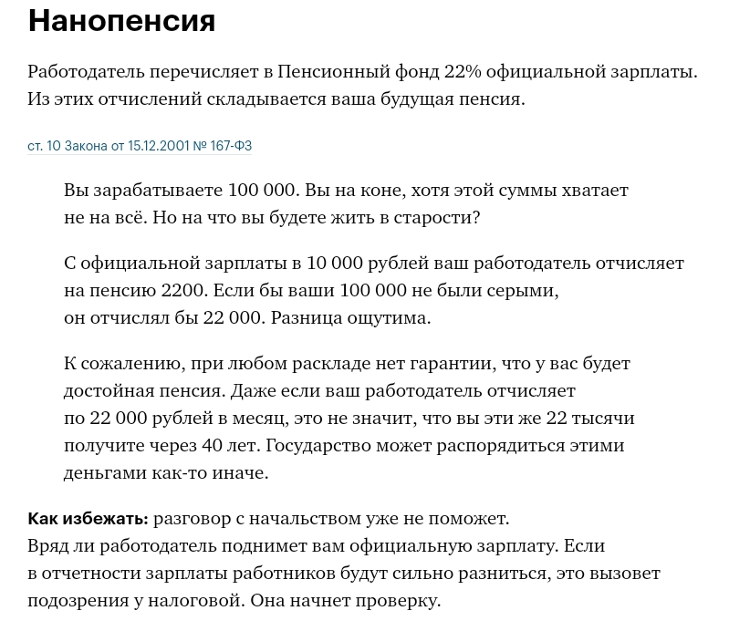 Приведен пример зарплаты 10 т.р. (остальное по серой схеме), а если "белая" 15 т.р.-хрен редьки намного слаще будет? Отказаться от "конверта" ради мифической пенсии? Жаловаться на работодателя (обложенного налогами со всех сторон) при дефиците рабочих мест? Жаль, что новых Примакова и Маслюкова не наблюдается. Только налоги и штрафы, налоги и штрафы...