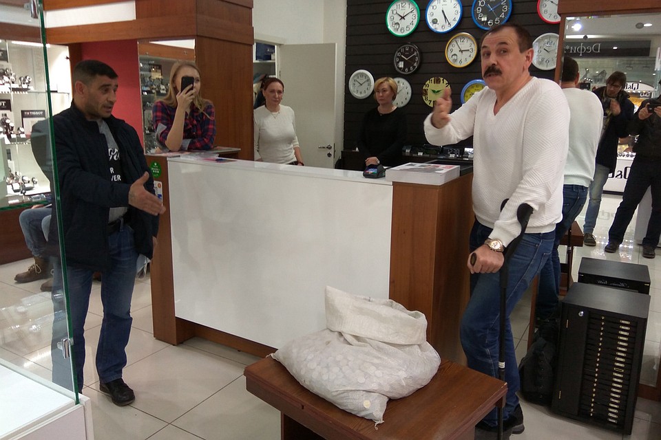 — Это не месть, а мой протест покупательскому экстремизму. Я считаю, покупатель хотел легко срубить денег, пусть попробует донести этот мешок до дому, — заявил владелец магазина часов Евгений Колотилин.