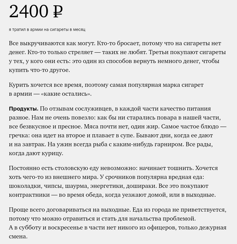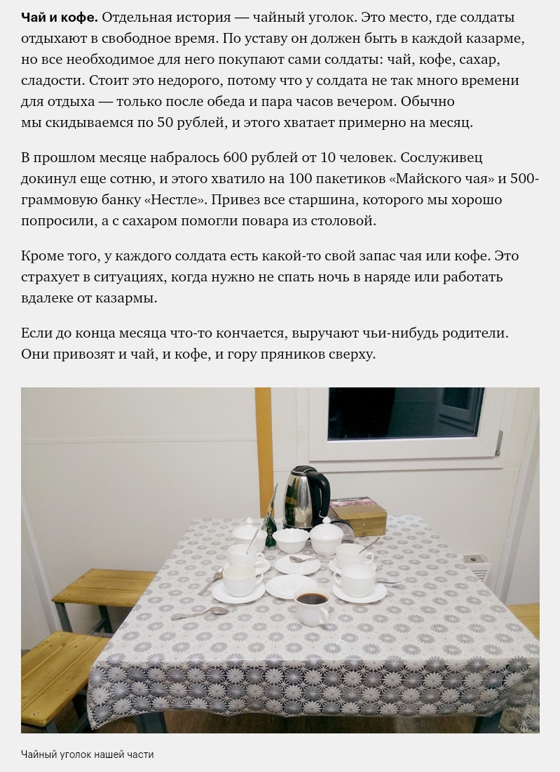 Интересный жизненный рассказ. Но, столько денег государство тратит на армию, а чай и кофе, сигареты приходится ребятам самим покупать. А какой беспредел на распределительном пункте - могут вещи забрать, могут оставить. И если у парня нет ни родителей ни 50-ти тысяч, ему там просто не выжить. Да, мощна Российская Армия!