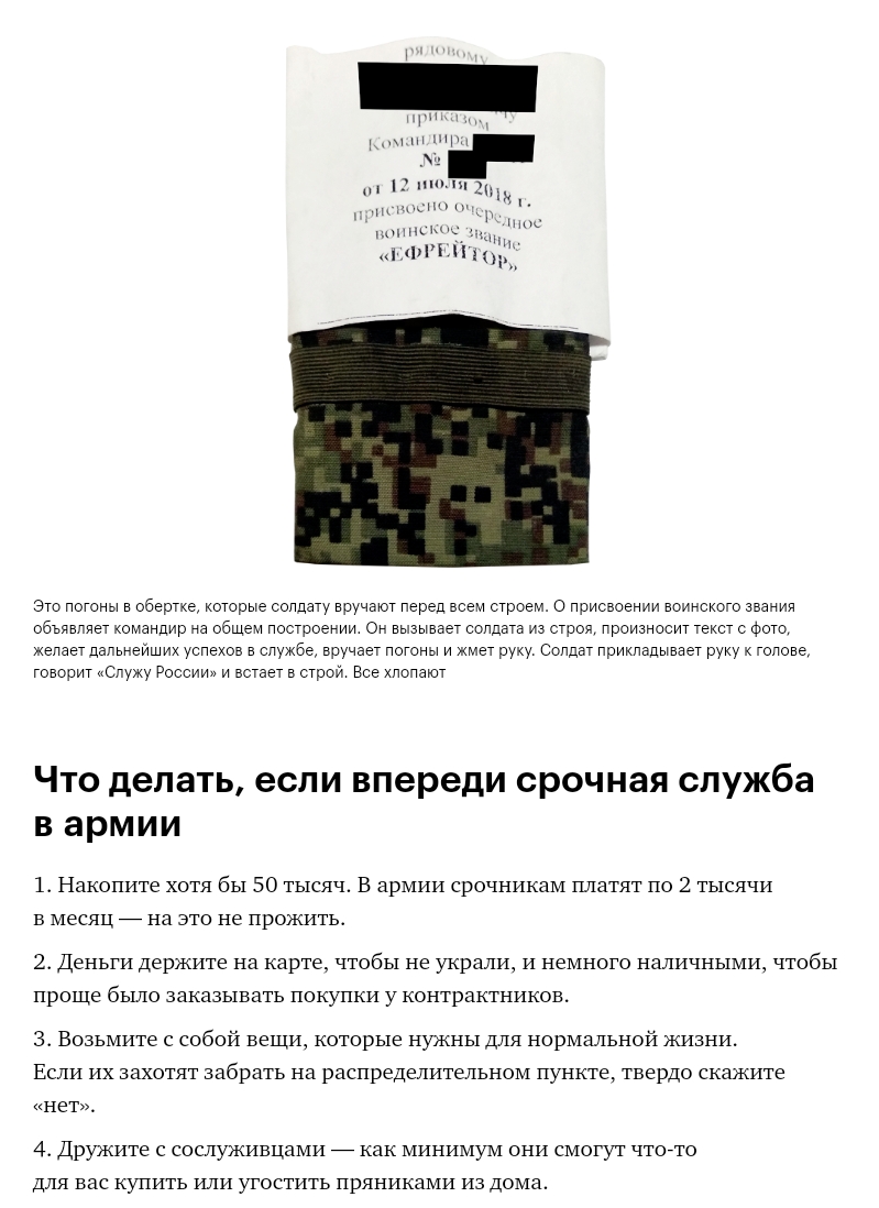 Бывает, что вещи новобранцев пытаются забрать в распределительном пункте: мол, это все запрещено. Так обычно действуют наглые прапорщики или срочники, которых отправили встречать новобранцев. Если уступить, про отданные вещи можно забыть. Но если твердо сказать «нет» — наглецы обычно отстают. В крайнем случае можно сослаться на пункт 174 устава внутренней службы. Нас на распределительном пункте было человек пятьдесят, и большинству удалось сохранить личные вещи — хотя кто-то растерялся и отдал.